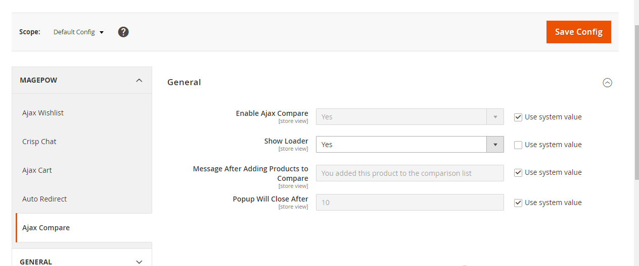 To Enable/DisableMagepow Ajax Compare Extension: Go to Admin Panel > Stores > Settings > Configuration > Magepow > Ajax Wishlist. Then, select Yes to Enable module/No to Disable the module
