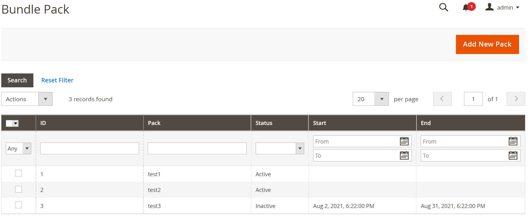 To create a new Bundle Packet please go to the admin panel → Magepow → Bundle Pack and click ‘Add New Pack’ button.