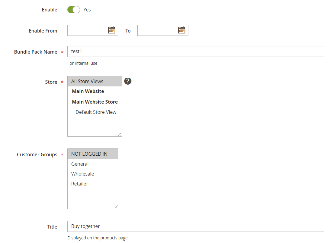 Enable From - specify the period during which the bundle pack will be active. The bundle will be automatically enabled and disabled on the specified date and time.