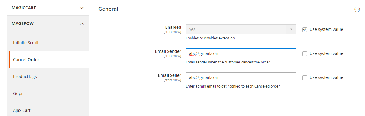 To Enable/Disable the module,go to Store > Configuration > Magepow > Cancel Order
