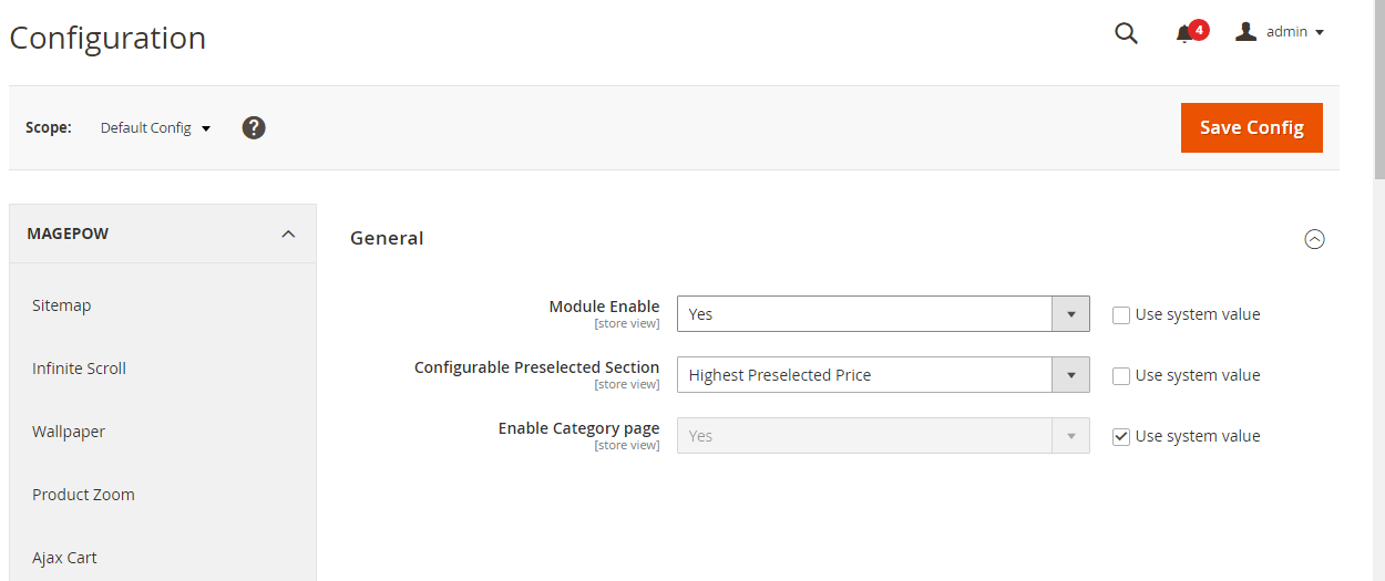 To Enable/DisableConfigurable Preselect Extension: Go to Admin Panel > Stores > Settings > Configuration > Magepow > Configurable Product Preselect. Then, select Yes to enable module No to disable the module