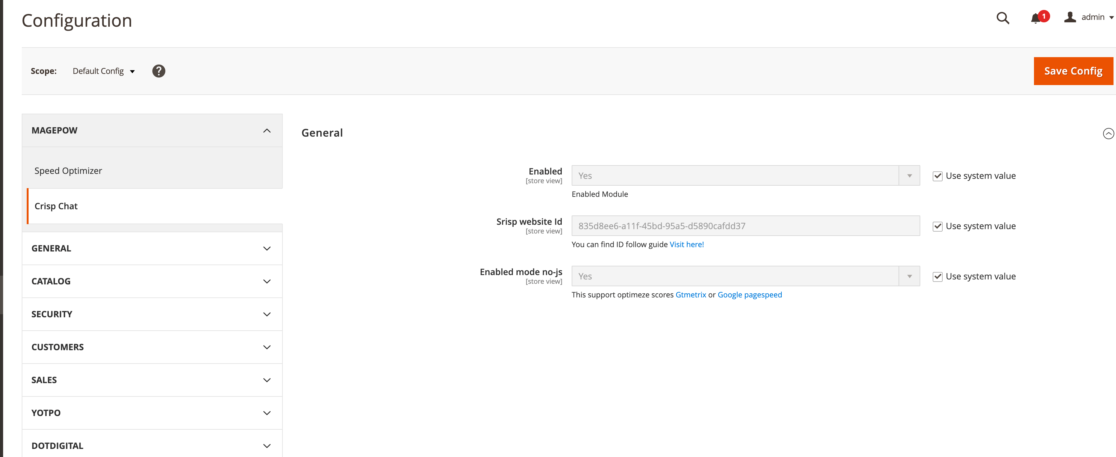 To Enable/Disable the module,go to Store > Configuration > Magepow > Crisp Chat