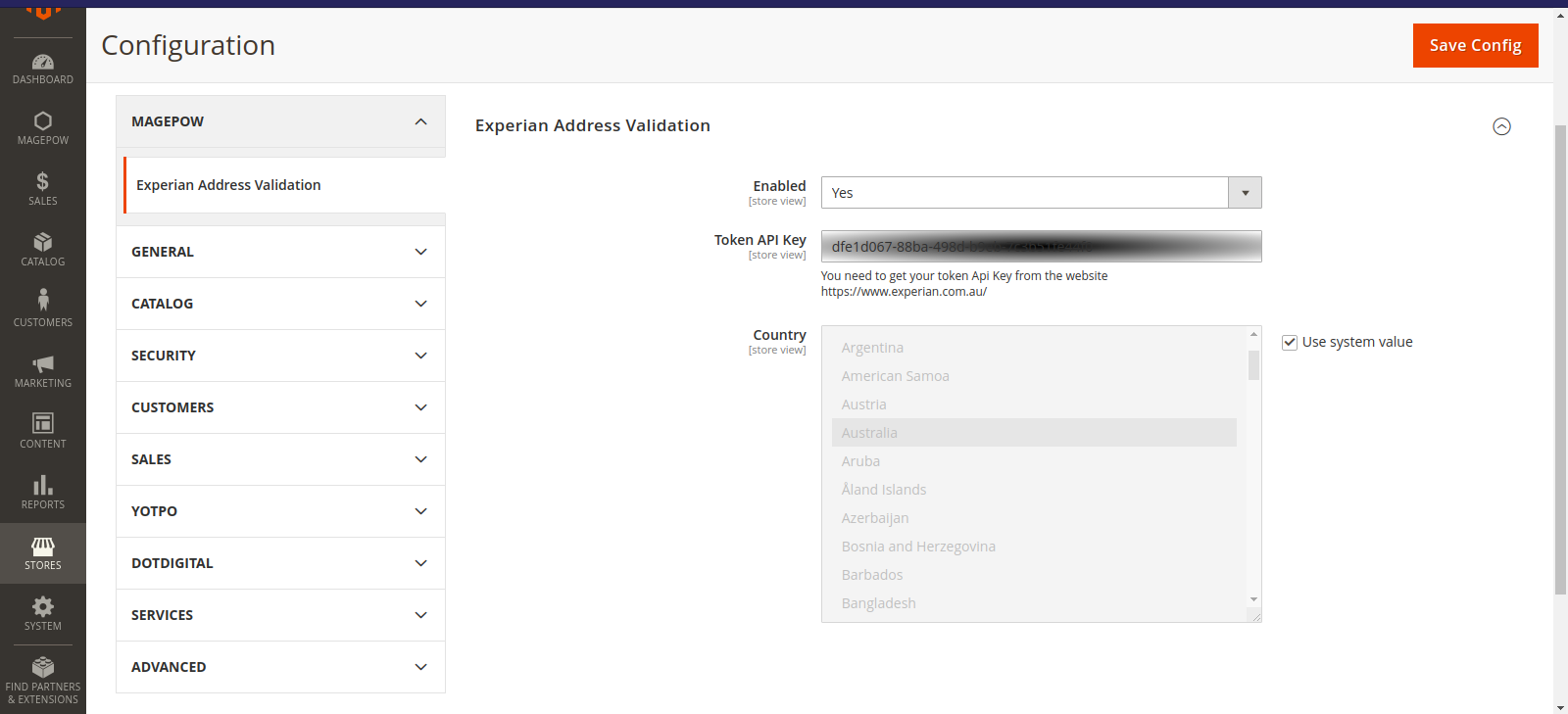 To Enable Magepow Speed Optimizer Extension: Go to Admin Panel => Stores => Configuration => Magepow => Experian Address Validation => Experian Address Validation. Then, select Yes to Enable module/ No to Disable the module.