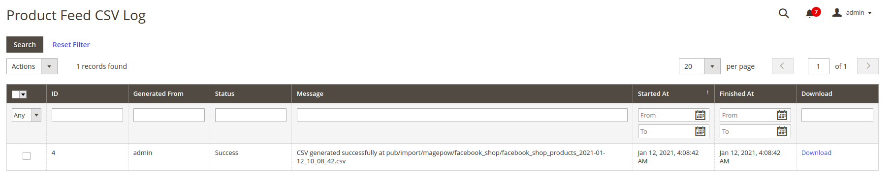 After generating the file CSV it will save in the Facebook feed CSV log.