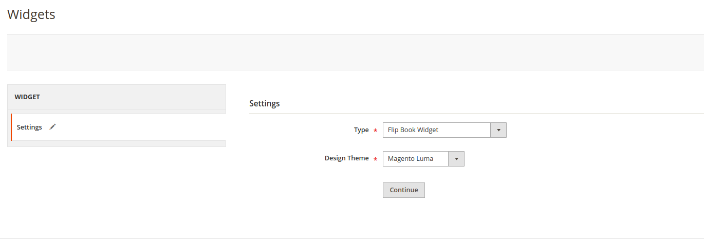 In Magento Admin > Content > Widgets > Add Widget > Setting > Setting type and design theme > Continue.