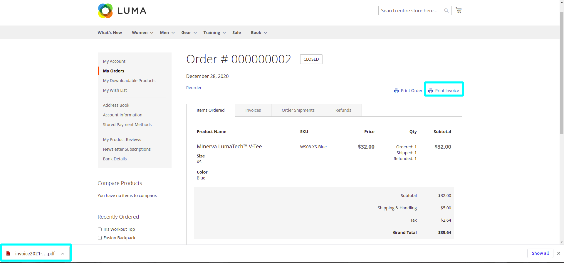 Login and go to My Account > My Order on store front, you will see Print Invoice button
