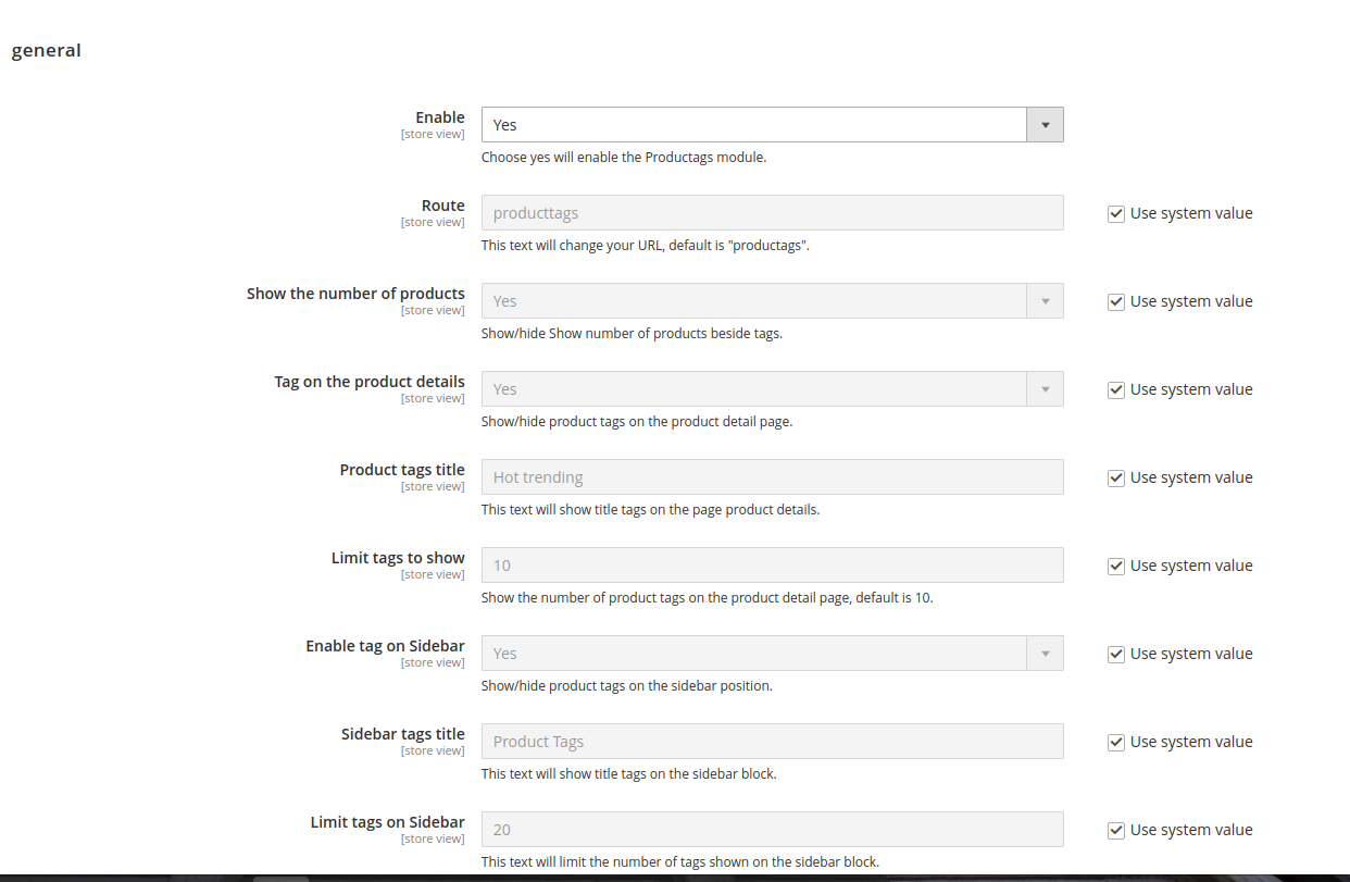To Enable/Disable Magepow Product Tags Extension: Go to Admin Panel > Stores > Settings > Configuration > Magepow > Product Tags. Then, select Yes to Enable module/No to Disable the module