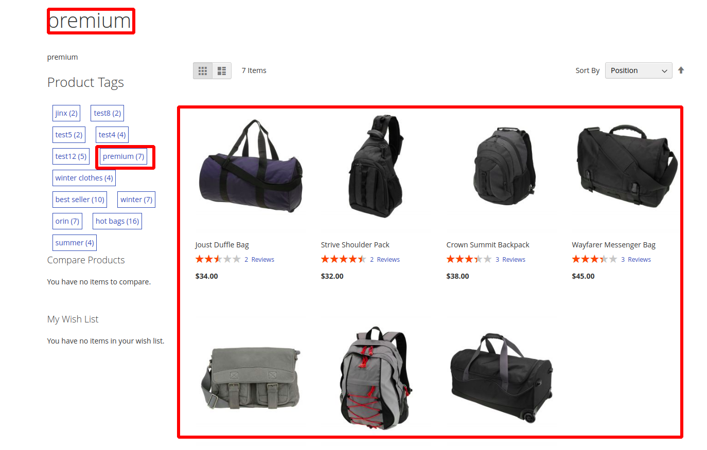 Click the tabs on the sidebar, in product details, or in the widgets section. Will display a tab containing the selected products in that tab.