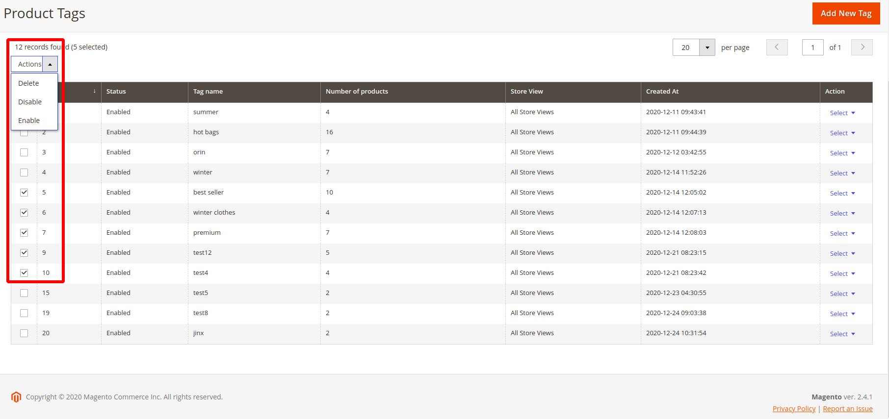 In the tag list, you can take bulk actions like batch delete, enable status, and disable multiple tags.