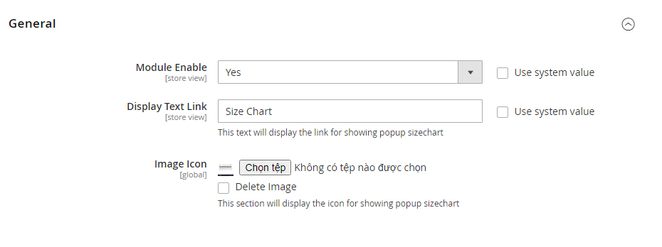 - Image icon : Select image icon (only using when user sets popup for displaying size chart)