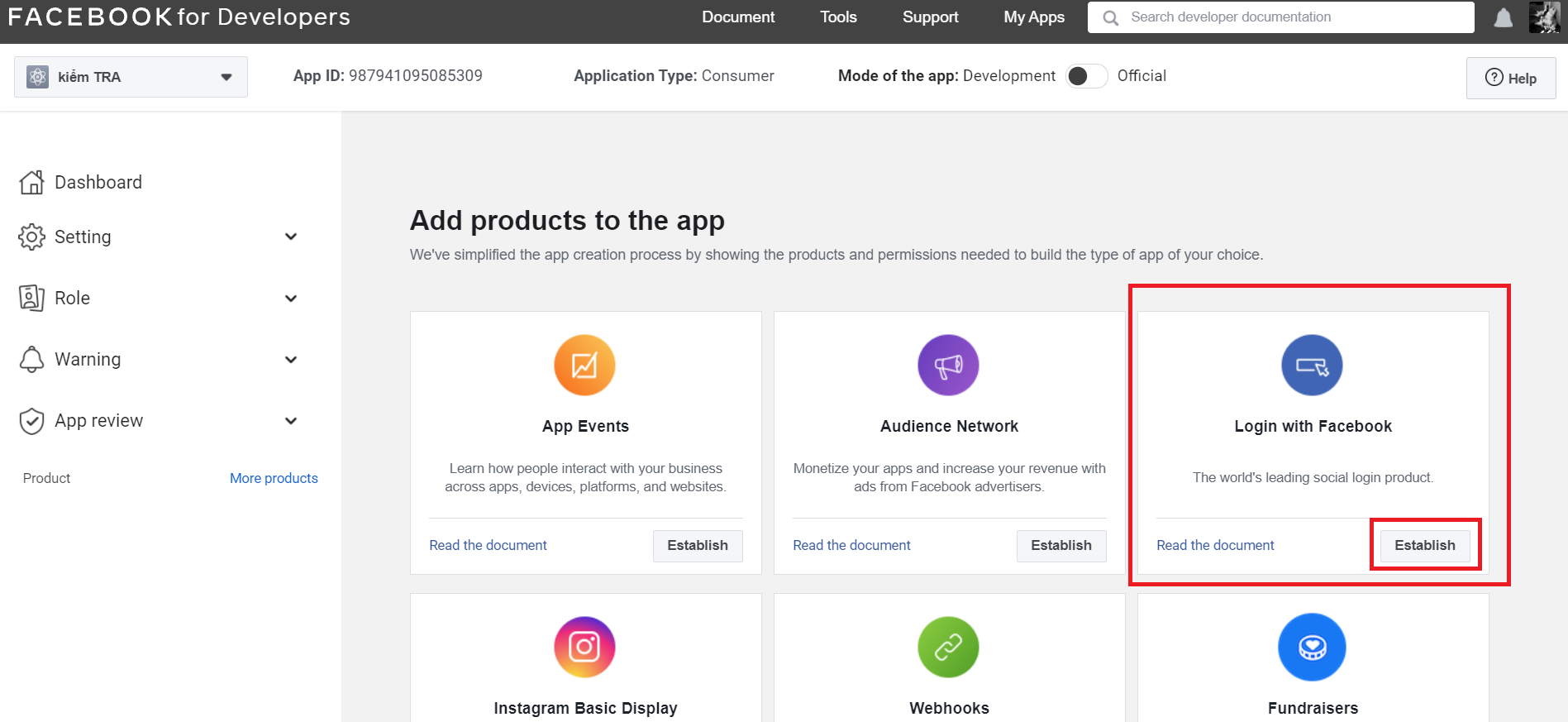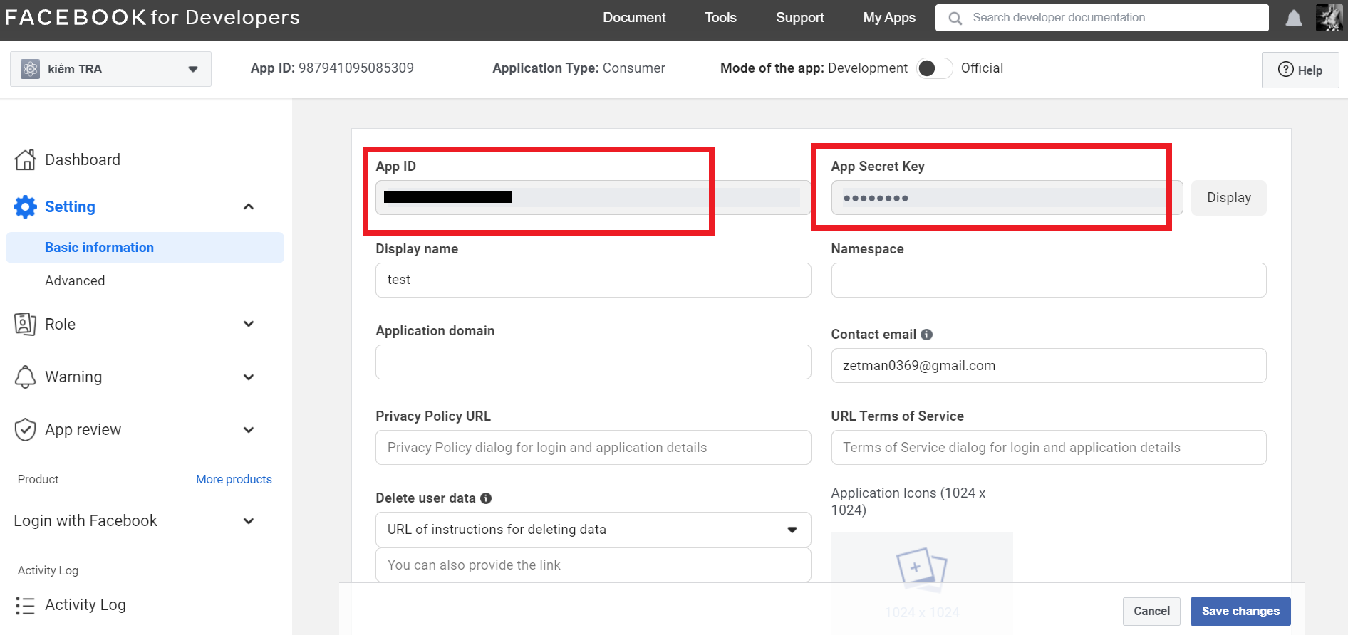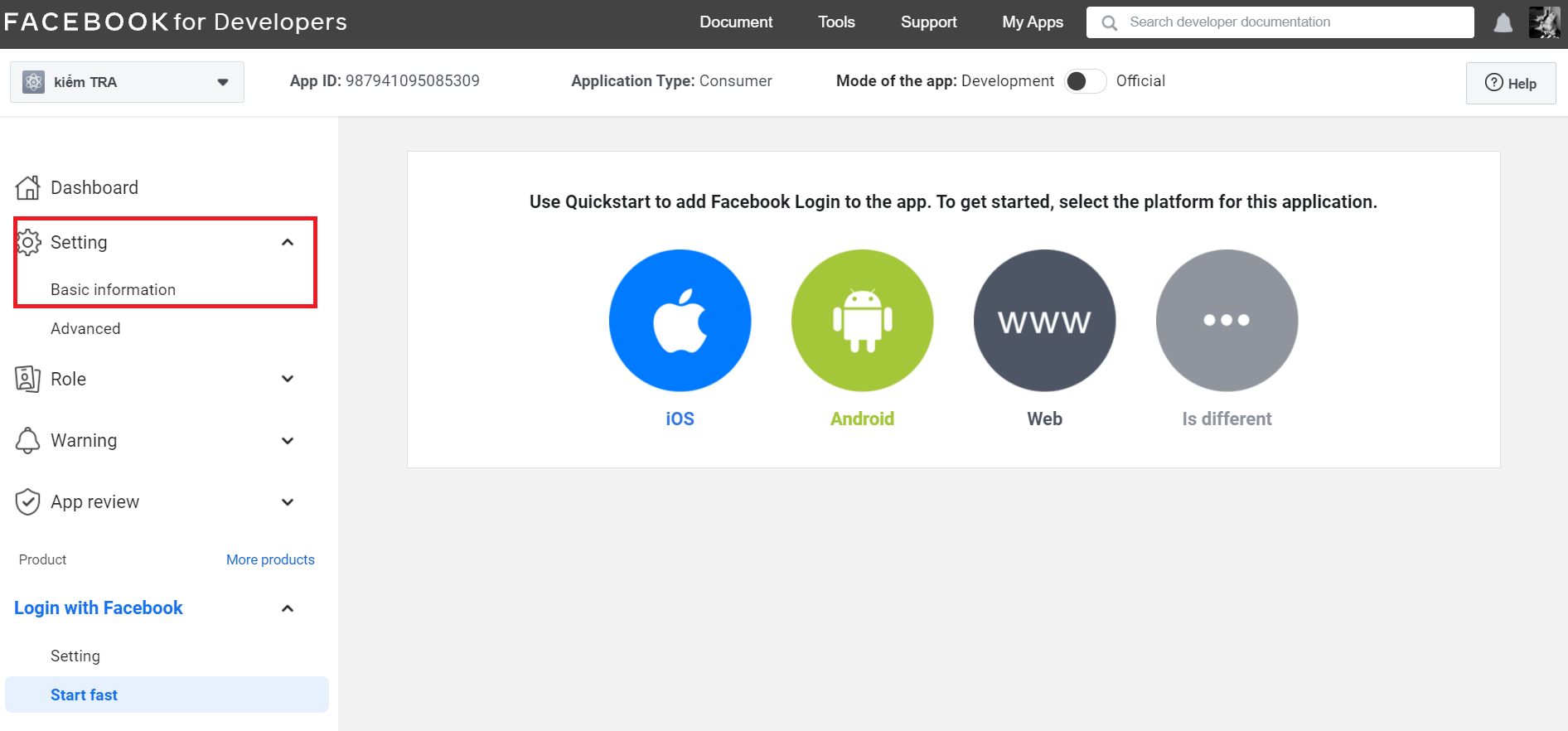 Come back to Setting -> Basic information like Step 6 then copy App ID and App Secret Key