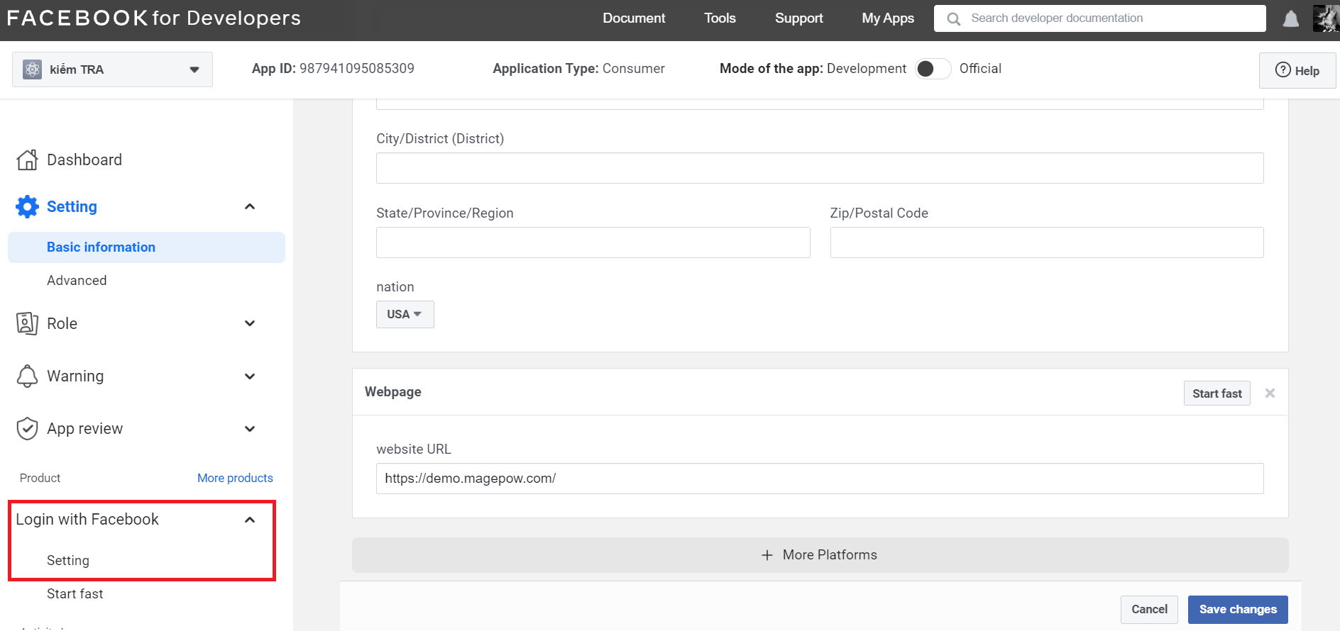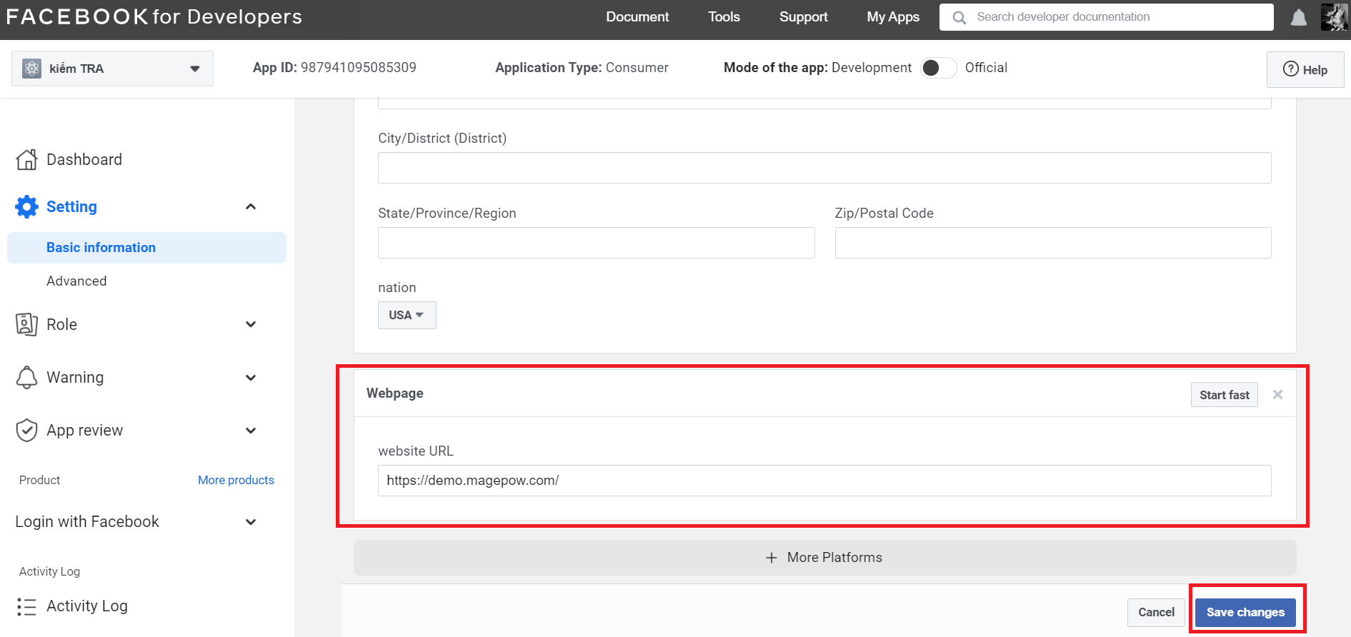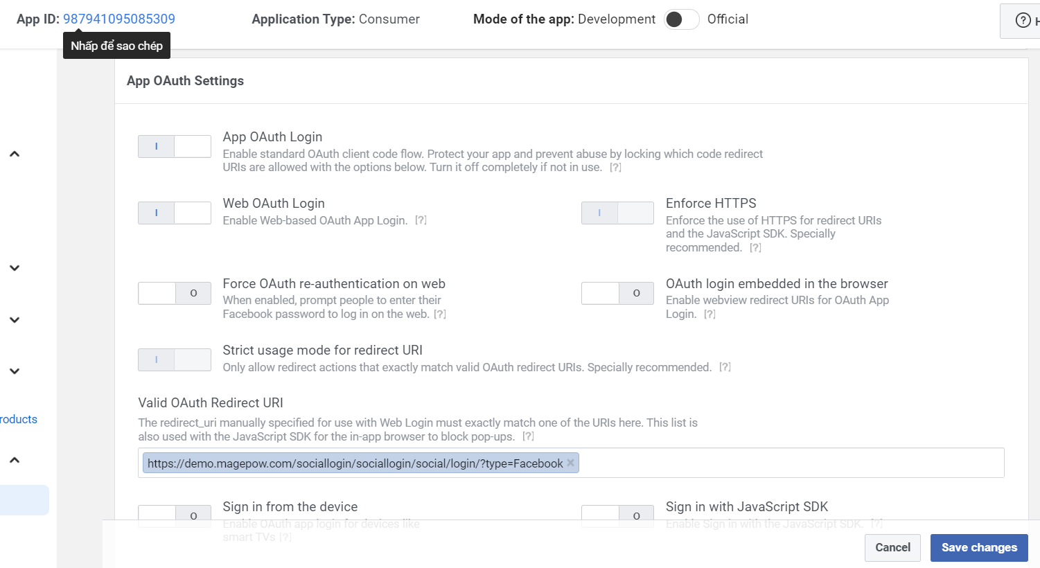 Come back to Setting -> Basic information like Step 6 then copy App ID and App Secret Key