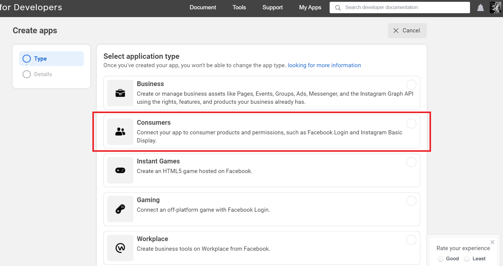 Login Facebook or create a new Facebook account. After that, click on My Apps from the Apps menu at the top
