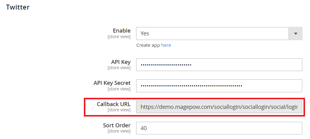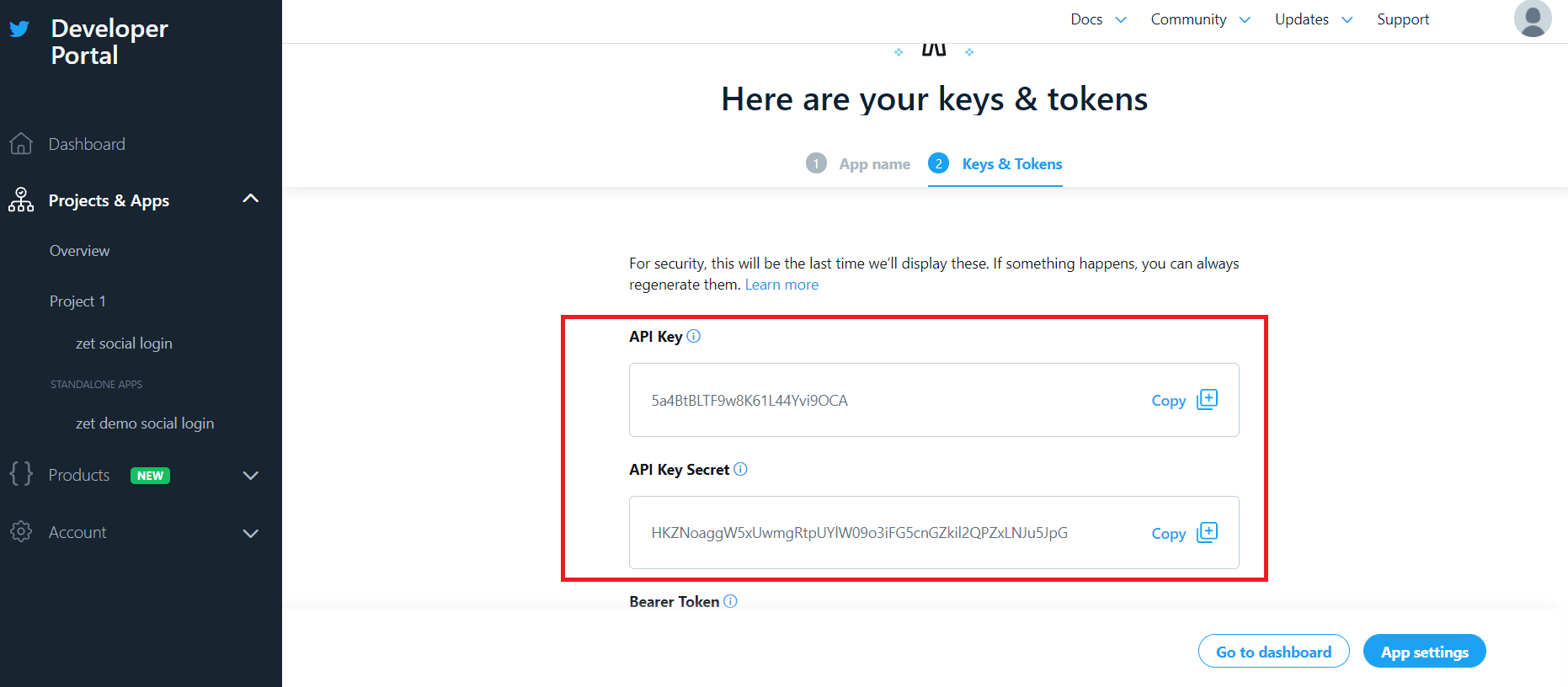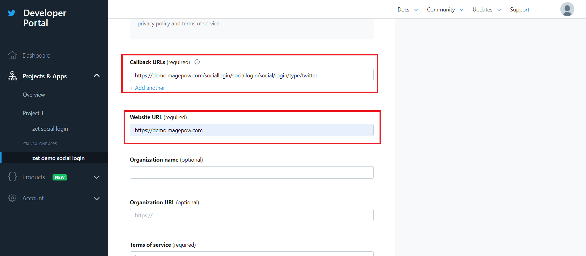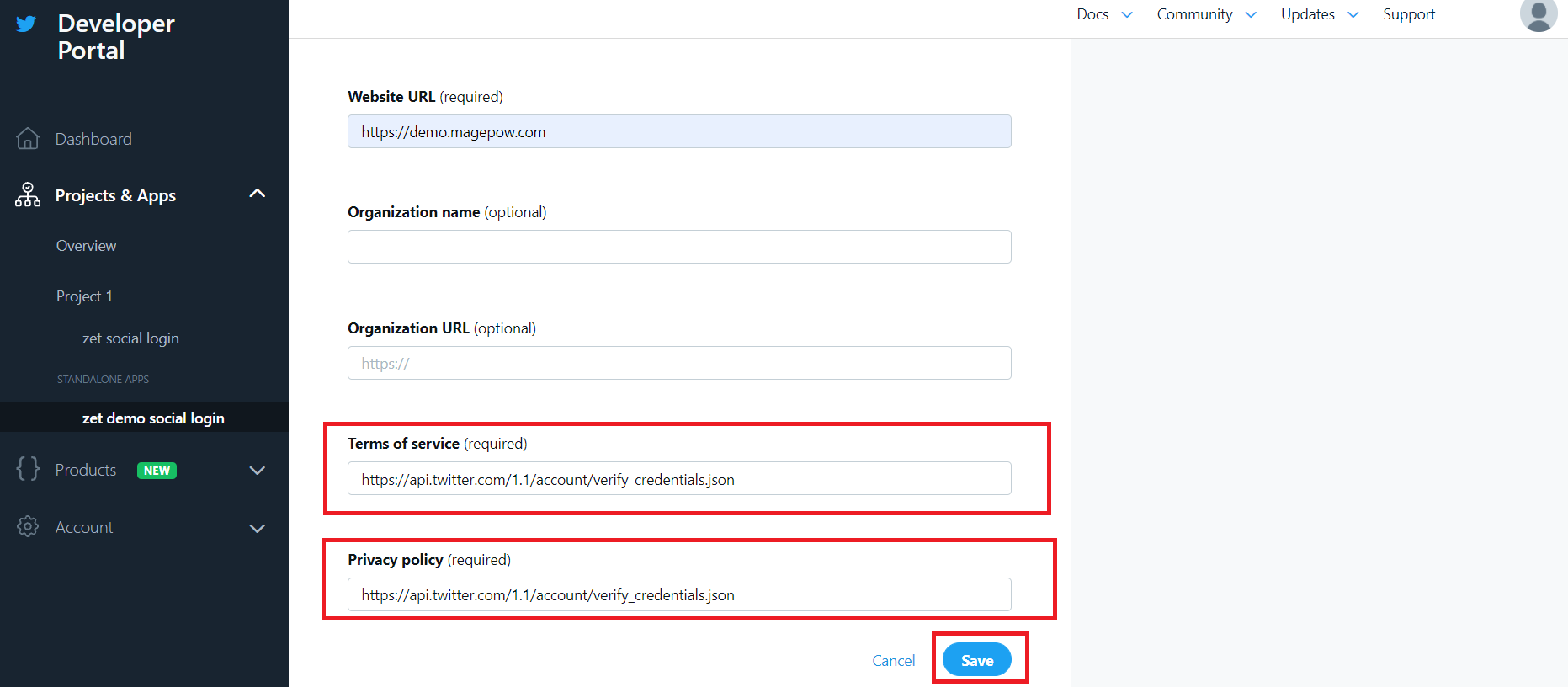 Paste this link "https://api.twitter.com/1.1/account/verify_credentials.json" to both TERMS OF SERVICE and PRIVACY POLICY fields then click Save