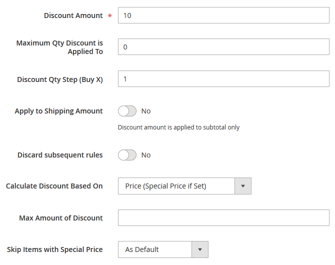 Max Amount of Discount - set the maximum discount amount that can be applied to one rule. It means that no matter how you configured the previous settings, the final discount can be more than you specify here. In our case, we'll not set any limitations.