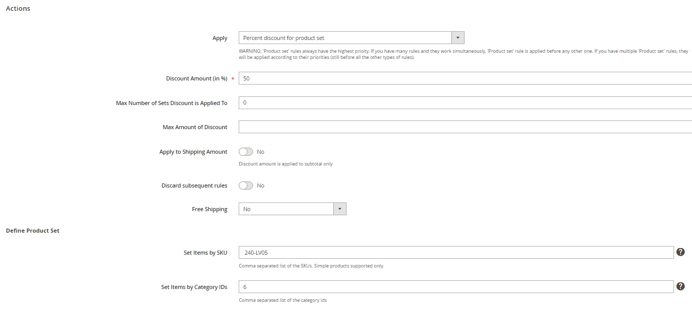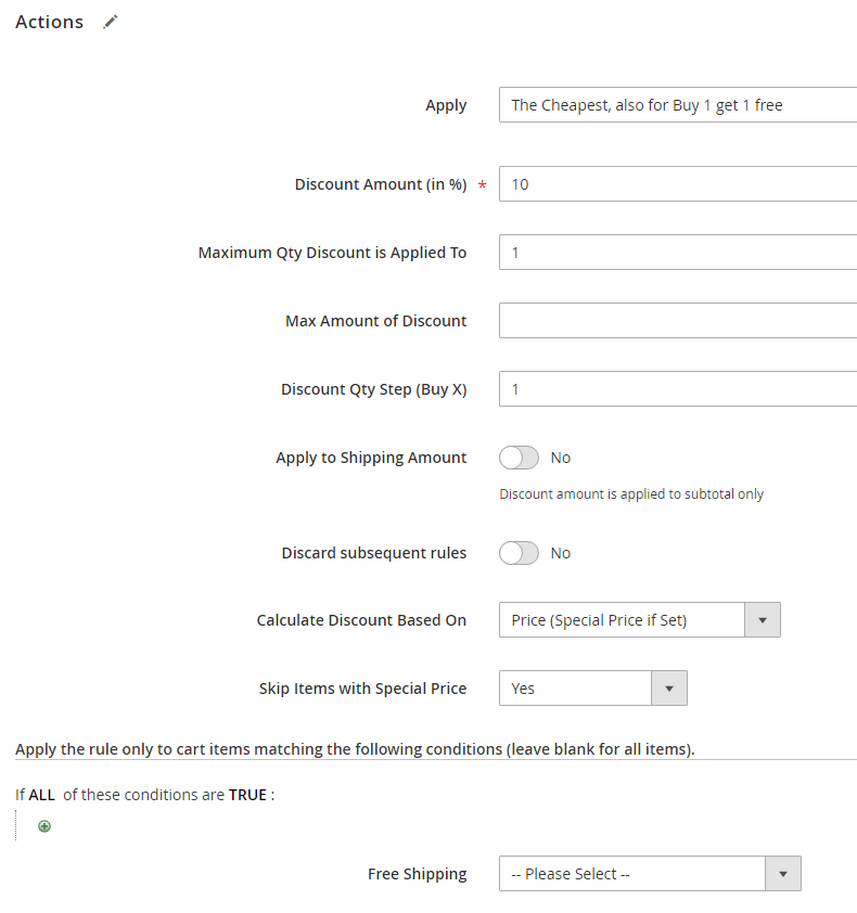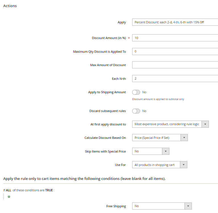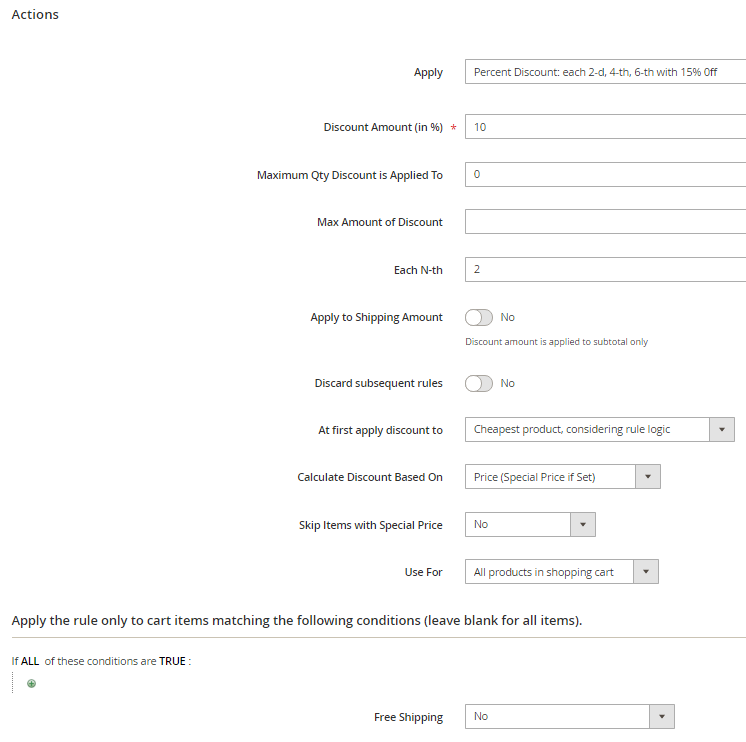 Apply to Shipping Amount - enabled this option only if you want to apply the discount to the sum of the Subtotal + the Shipping Rate. We don't need this for our promotions, so we set to 'No'.