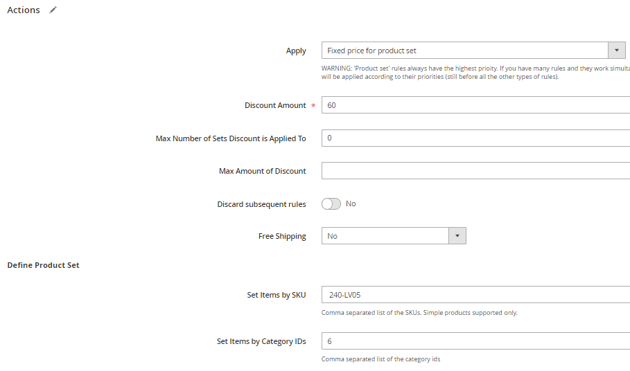 This action works exactly the same as Percent discount for product set above, but it will give a fixed amount of discount instead of percent discount.