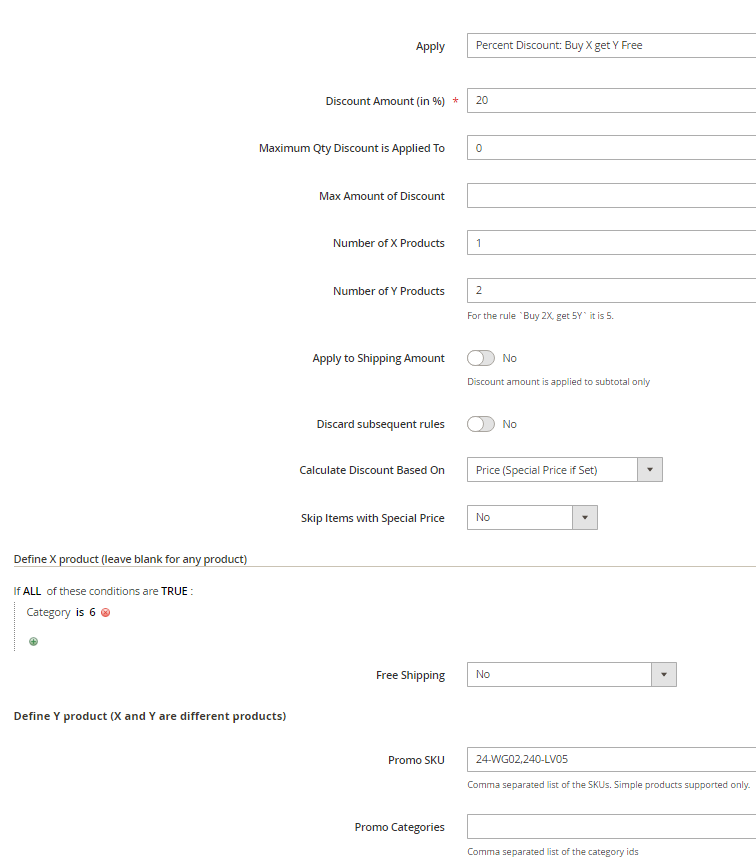 I keeps previous settings and add only number 6 in Promo Categories field. When you set value on both Promo Categories and Promo SKU fields, Y products will be the combination of both fields. In this case, Y products are LifeLong Fitness IV, Push It Messenger Bag and every product in category 6.