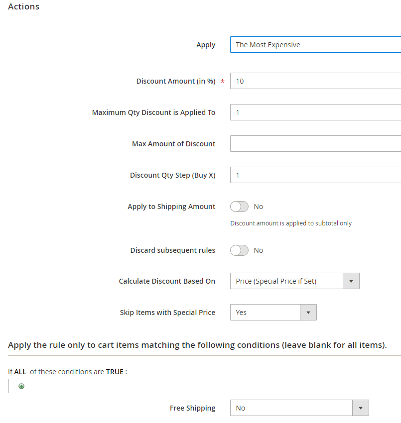 The Most Expensive action works just the same as The Cheapest, but instead of calculating discount based on cheapest product, it checks the price of most expensive product instead.