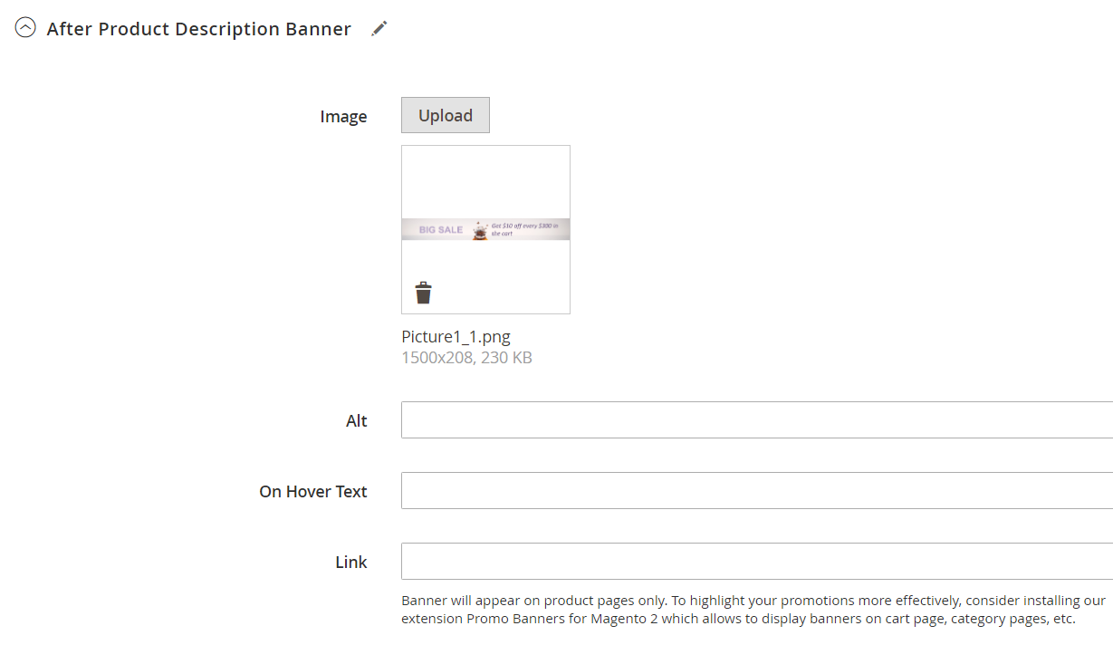 At first, specify for which products the banners/labels should be shown. You can choose to display them for all products, for particular product categories or only for special products.