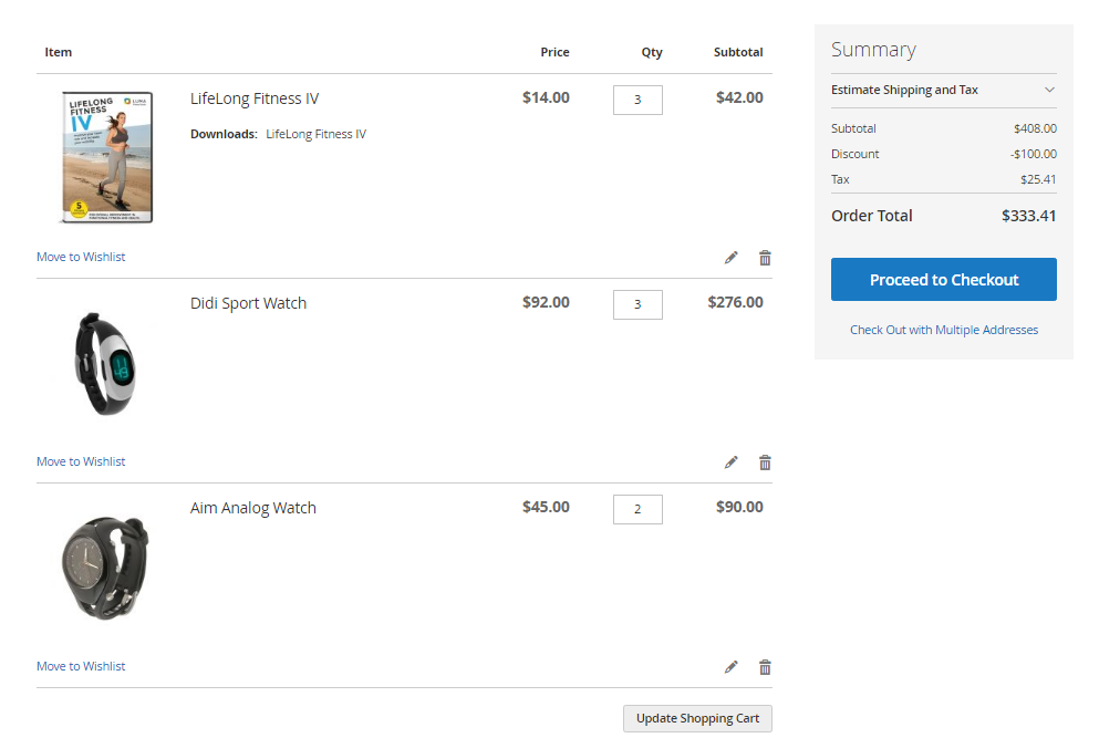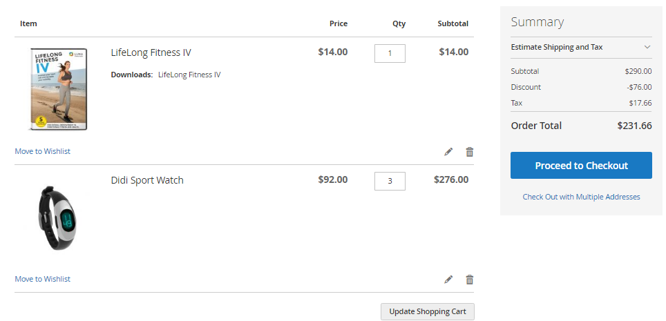 LifeLong Fitness IV have qty is 6, 6 > 4, so all 4 items receive discount will be LifeLong Fitness IV.The discount amount is $14 * 4 * 20% = $11.20.
