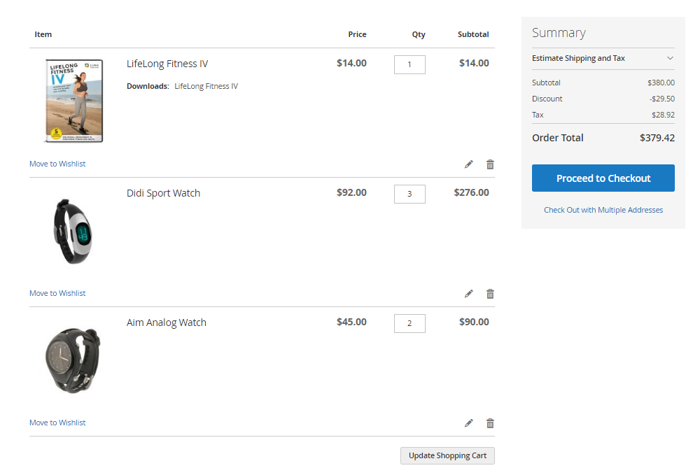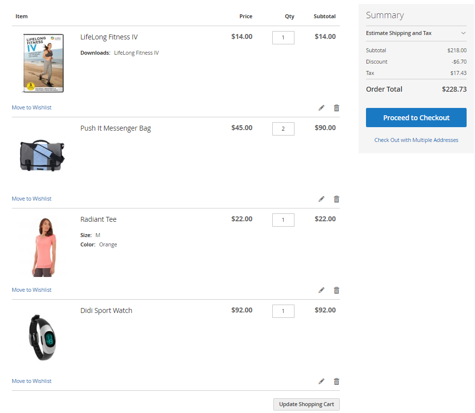 Note, that the discount will be applied to each second item in the cart and items sort from lowest to highest price - the Use For field is set to All Products in Shopping Cart and At first apply discount to field is set to Cheapest product. Now in cart, the rule counts LifeLong Fitness IV as 1st, Radiant Tee as 2nd, Push It Messenger Bag have quantity is 2 so it will be counted as 3rd and 4th and Didi Sport Watch: as 5th. Base on the rule, only 2nd and 4th items get discounted. So $22 * 10% = $2.20 sum with $45 * 10% = $4.50. We have $6.7. Match!