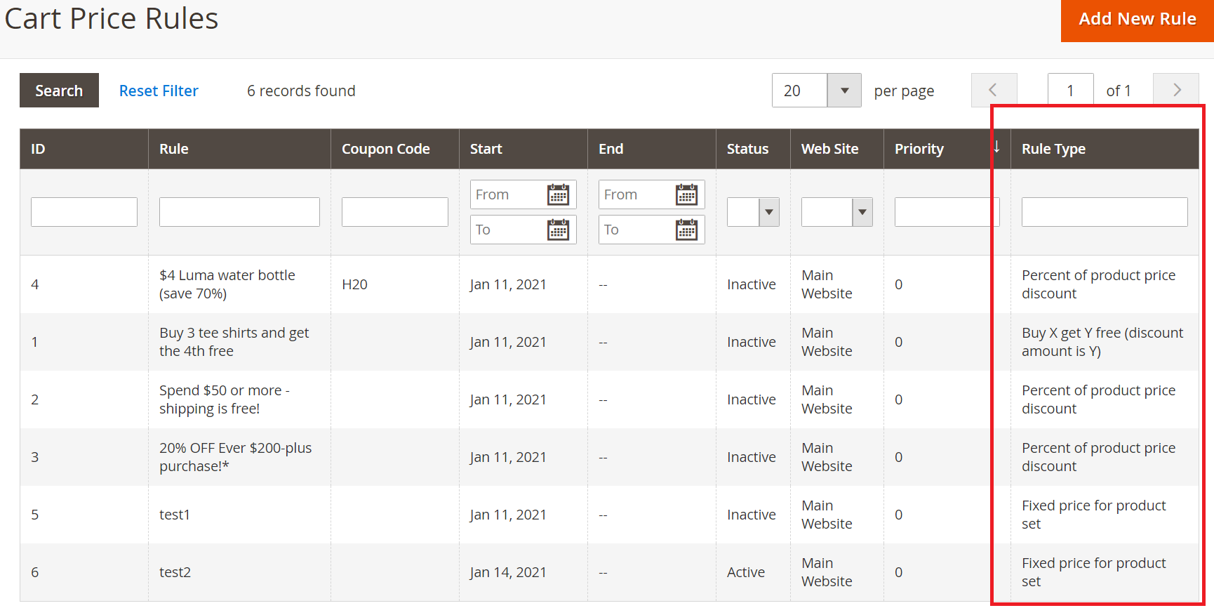 To create promotion rules please go to the admin panel → Marketing → Cart Price Rules and click ‘Add New Rule’ button.