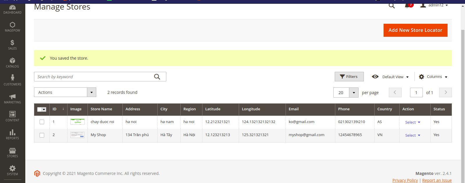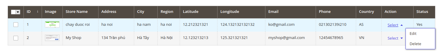 You can add a new store by clicking on "Add New Store Locator" or click on Action => Select => edit to edit store details. If you want to delete any store, press Action => Select => Delete